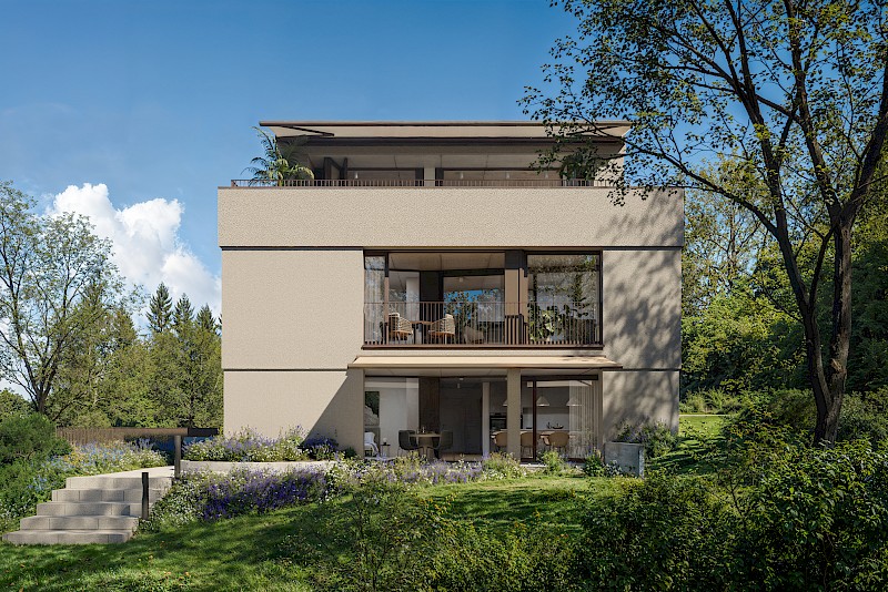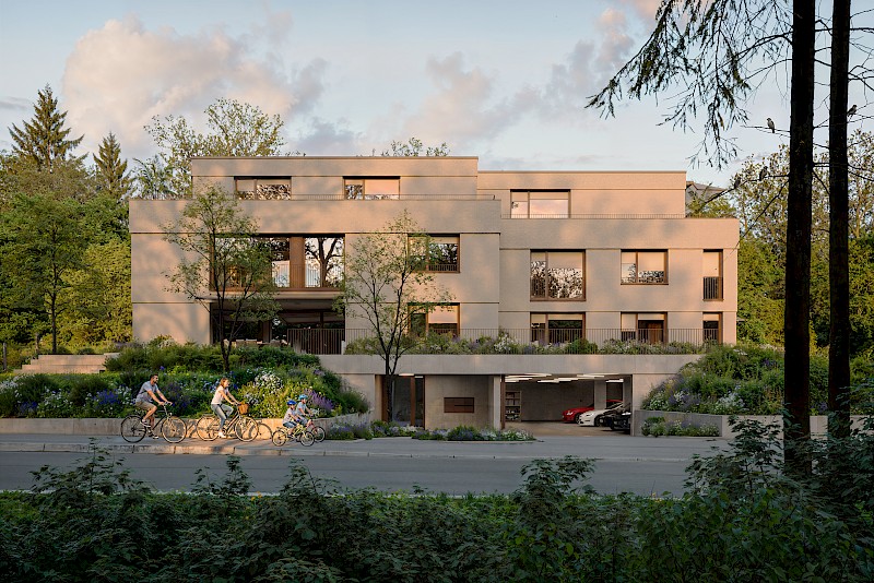 Die zeitgemässe Architektur überzeugt durch den Einsatz natürlicher, edler Materialien, sowohl an den Fassaden als auch in den Wohn- und Allgemeinbereichen – und schafft so ein harmonisches und hochwertiges Gesamtbild.