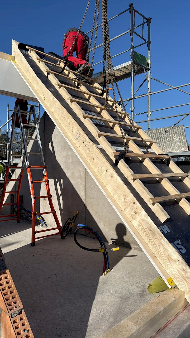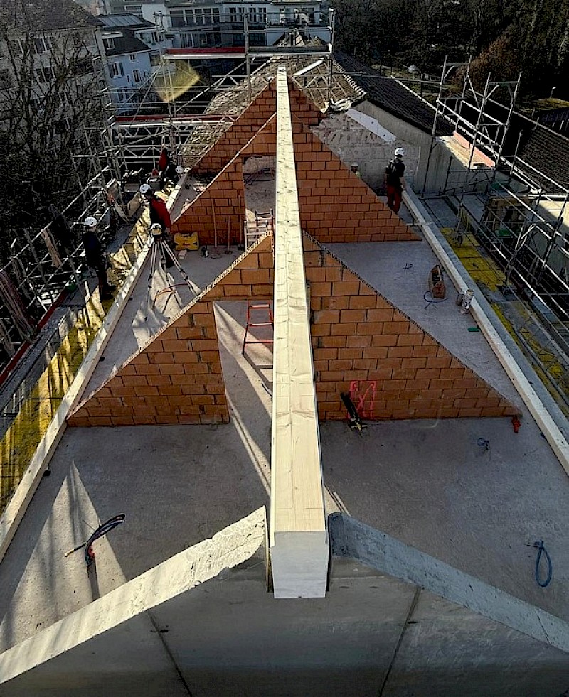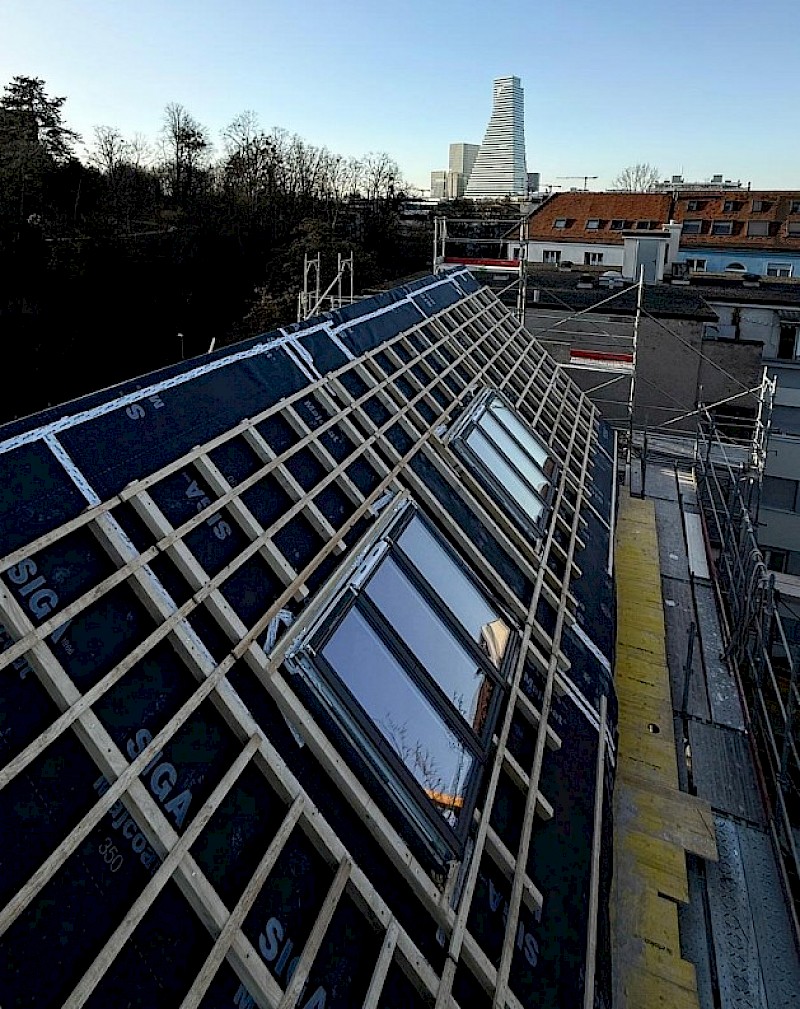 Die Erweiterung erfolgt durch eine zusätzliche Dachebene, verbunden über eine interne Treppe. Terrassen auf der Strassen- und Hofseite gewährleisten eine gute Besonnung sowie differenzierte Aussenräume.